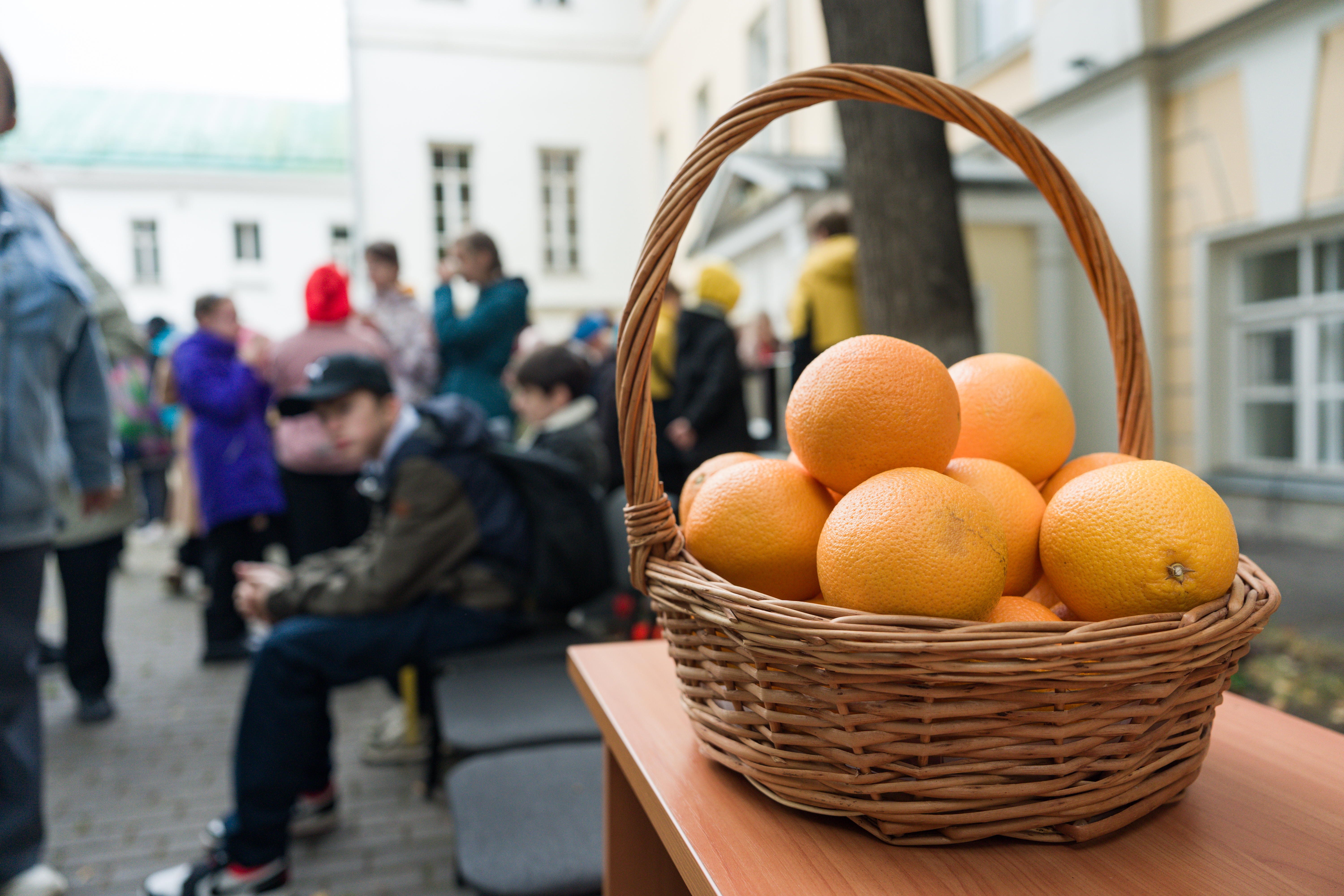 Студентов в конце мероприятия угостили апельсинами. Апельсин — символ мемориальной комнаты музея Ф. П. Гааза, олицетворяющий надежду и веру в лучшее.